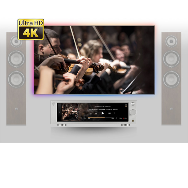 Большую часть передней панели RS250 шириной чуть менее 30 см занимает широкоэкранный IPS-дисплей. Он сенсорный, как на смартфоне и, собственно, как и смартфон, дает пользователю управление функциями устройства и приложений встроенной операционной системы, которая основана на Android. Обновление функций проигрывателя таким образом заключается в установке новых приложений или их обновлении через интернет.