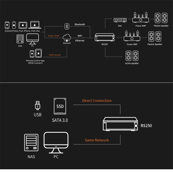 Фонотека может храниться локально (USB-накопители, можно также установить в RS250 накопитель SSD), в сети (NAS, сетевые ресурсы, UPnP/DLNA, Roon), К HiFi Rose RS250 можно подключиться через Bluetooth, Wi-Fi, Airplay с мобильного устройства. При наличии учетных записей доступно получение контента от интернет-служб (TIDAL, QOBUZ, Spotify Connect).