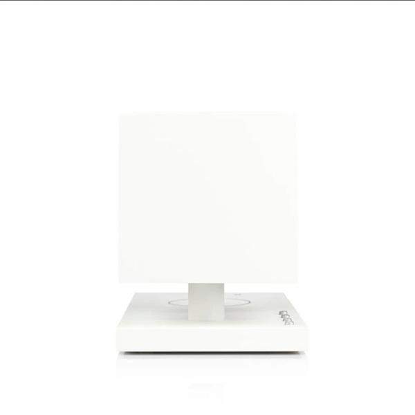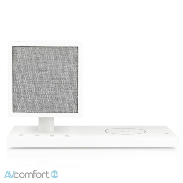 Информация взята с сайта avcomfort.ru Светодиодная панель расположена на верхней грани куба и оснащена ступенчатым диммером на 4 положения. Мощность светильника 2,5 Вт, что приблизительно равно по яркости свечения лампе накаливания на 25 Вт. Для портативных устройств, не оснащенных беспроводной зарядкой, предусмотрен порт USB. Интерфейс Bluetooth — версии 5.0, также имеется разъем 3,5 мм для аналоговых источников. Вариантов оформления три: ореховое дерево с серым, пепельный с черным, белый с серым.