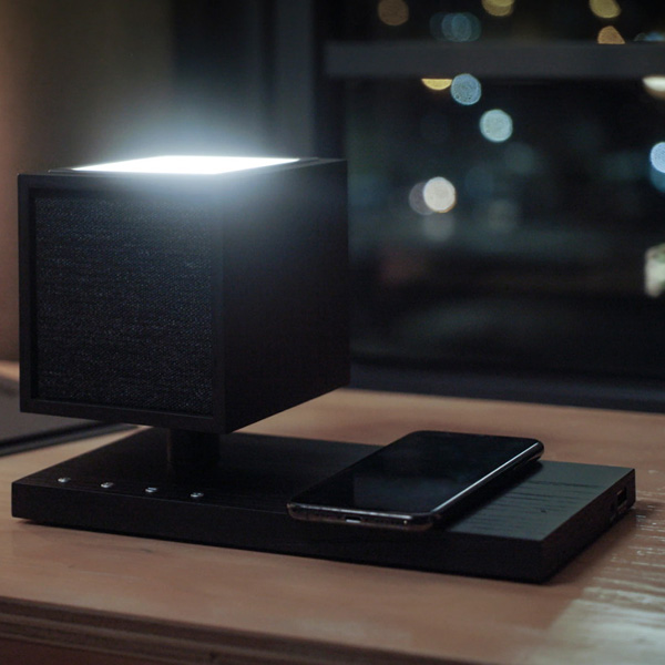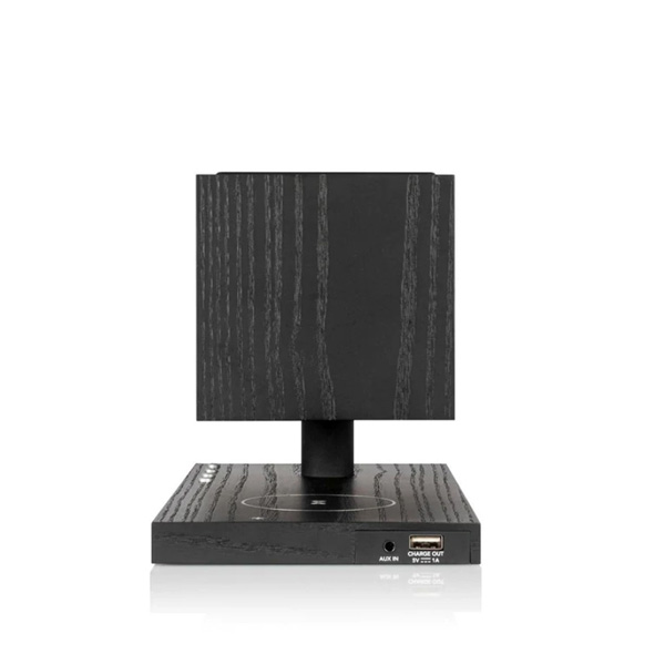 Информация взята с сайта avcomfort.ru Светодиодная панель расположена на верхней грани куба и оснащена ступенчатым диммером на 4 положения. Мощность светильника 2,5 Вт, что приблизительно равно по яркости свечения лампе накаливания на 25 Вт. Для портативных устройств, не оснащенных беспроводной зарядкой, предусмотрен порт USB. Интерфейс Bluetooth — версии 5.0, также имеется разъем 3,5 мм для аналоговых источников. Вариантов оформления три: ореховое дерево с серым, пепельный с черным, белый с серым.