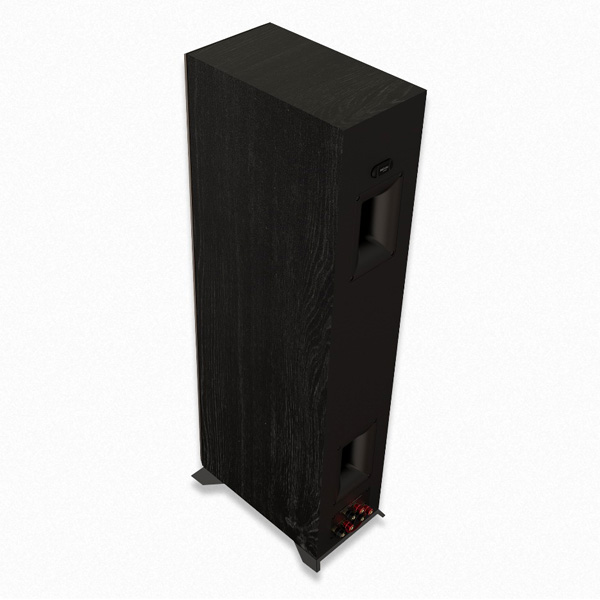 Акустическое оформление модели представляет собой фазоинвертор, два его порта Tractrix Port выведены на заднюю панель. Для подключения к усилителю предназначен блок из двух пар винтовых клемм. Здесь же имеются два дополнительных разъема для подсоединения колонок Atmos, устанавливаемых на верхнюю панель напольной акустики. ..
