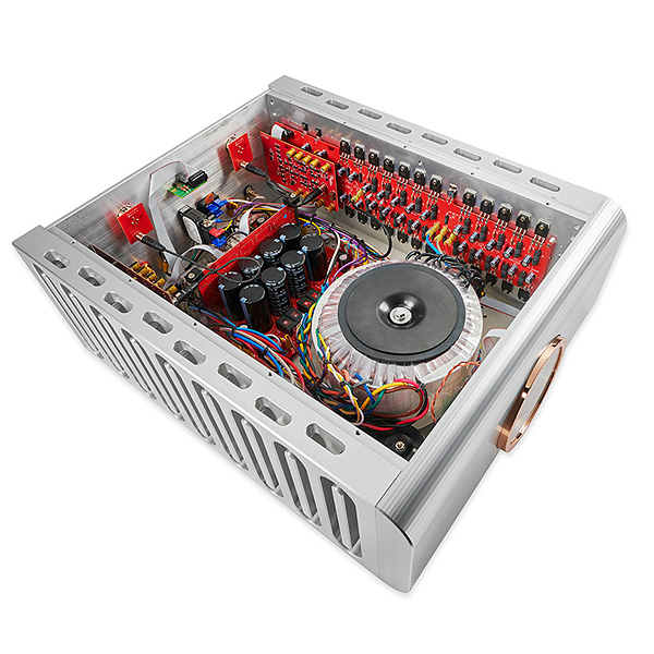 На этот фундамент опирается полностью комплементарный каскад драйвера, а выходной каскад оснащен 48 транзисторами - по 24 для левого и правого каналов, генерирующих впечатляющий звуковой результат. Первоначально используемые в усилителе Relentless Mono выходные транзисторы стали основой для модернизированного выходного каскада Progression S350. Эти транзисторы имеют улучшенную высокочастотную характеристику, имеют на 50% большую мощность, и обеспечивают более жесткое согласование коэффициента усиления с допуском между комплементарными парами NPN / PNP. Более широкая безопасная рабочая зона и превосходная линейность усиления дают большую термостабильность во всем диапазоне мощности усилителя.