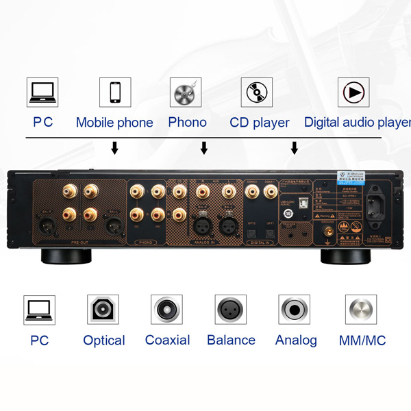 В AD-1PRE Plus имеется встроенный фонокорректор с раздельными входами RCA для ММ и МС головок. Линейных входов три — CD, AUX и балансный XLR. Симметричная аналоговая секция построена на прецизионном операционном усилителе OPA1632 от Texas Instruments с малым уровнем шумов. С него сигнал поступает на электронный регулятор громкости — микросхему JRC MUSES72320, обеспечивающую диапазон регулировки 111,5 дБ с шагом 0,25 дБ при низких искажениях и отличном разделении каналов.