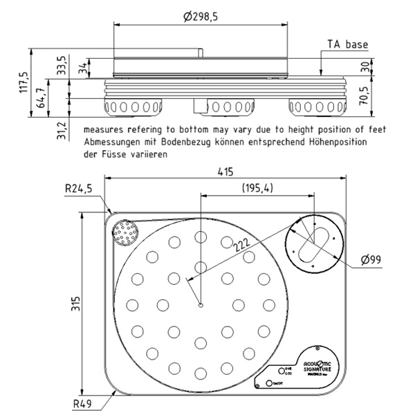 Виброгасители в опорном диске (Silencer Technology). Еще в 2000 году Acoustic Signature изобрела и внедрила новую систему гашения вибраций главного (на который кладется пластинка) диска проигрывателя. Система вставок (виброглушителей) действует просто и чрезвычайно эффективно.