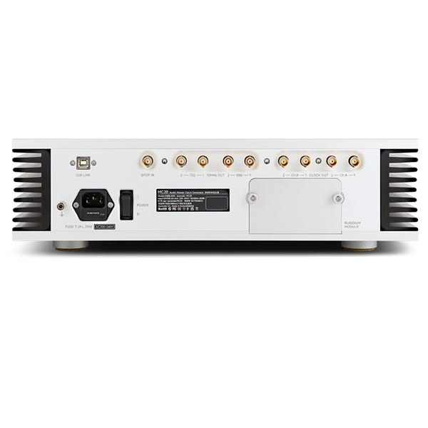 Рубидиевый тактовый модуль, используемый в MC20, представляет собой исключительно стабильную и точную конструкцию, обеспечивающую новый низкий уровень фазового шума и джиттера. Его безупречная производительность обеспечивает новый уровень яркой четкости с трехмерной шириной, глубиной и высотой звукового поля, которое он создает. Уменьшение джиттера и фазового шума устраняет любые следы «цифровых бликов» и вместо этого придает аналоговую теплоту и натурализм любому цифровому источнику звука.