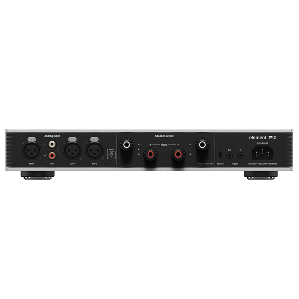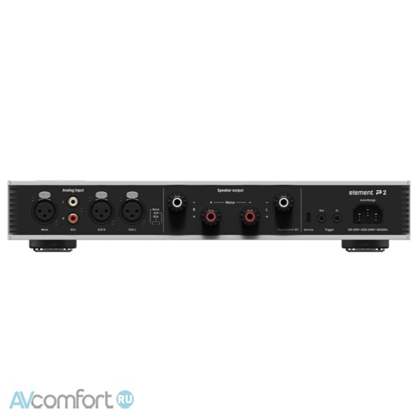 Информация взята с сайта avcomfort.ru В стереофоническом режиме Element P2 обеспечивает выходную мощность 230 Вт на канал при нагрузке 4 Ом и без особых усилий контролирует полочные или небольшие напольные колонки.
