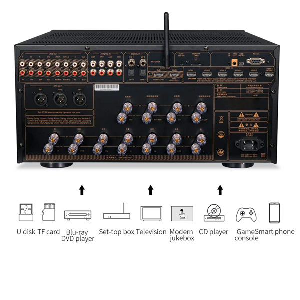 Простое меню для легкого управления и настройки. Вы можете настроить параметры для лучшего звукового эффекта на экране телевизора, во время работы AV ресивера. 11 каналов усиления для колонок и три выхода для сабвуфера. Конфигурации для размещения: 3.1/5.1/7.1/5.1.2/5.1.4/7.1.2/7.1.4/7.1.6/9.1.4. Он поддерживает независимую регулировку громкости для каждого канала, включая три сабвуфера. С качественными компонентами схема аудиофильского уровня оказывает мощную поддержку для достижения профессионального качества звука.
