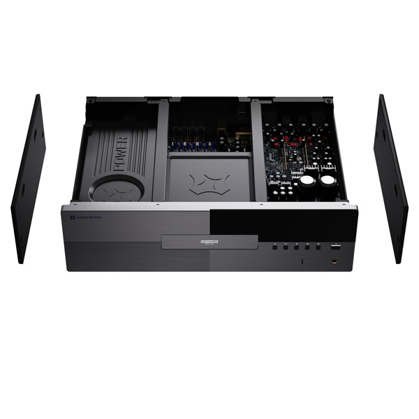 Модель Magnetar UDP900 имеет габариты 445x321x133 мм (включая опоры) и массу 15,5 кг. Корпус изготовлен из алюминиевого сплава c двухслойной стальной рамой в основании. Внутренние компоненты имеют независимое экранирование с использованием металлического короба, что позволило значительно снизить вибрацию, шум и помехи от внешних магнитных полей и добиться чистого звука и изображения.