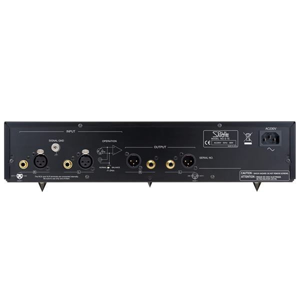 Мощный, балансный выходной сигнал достигается за счет использования полностью балансного буферного усилителя без NFB, который способен управлять даже громкоговорителями. Небалансные выходы выводятся только через балансный выход HOT, как и в других продуктах Soulnote.