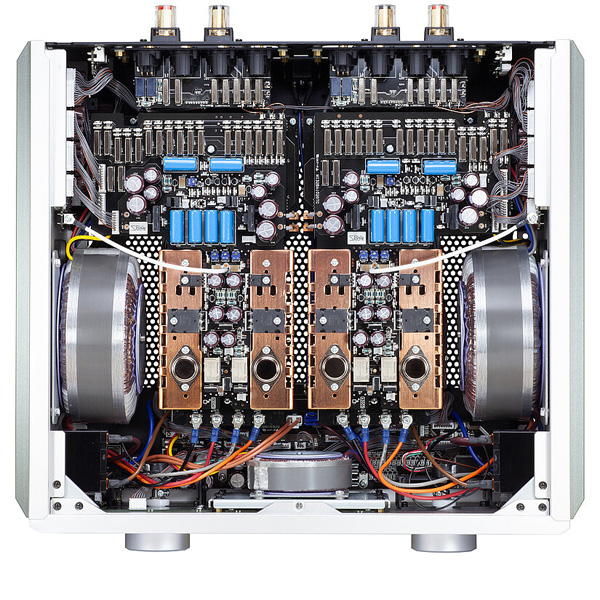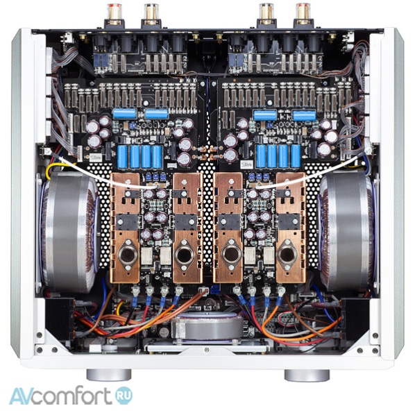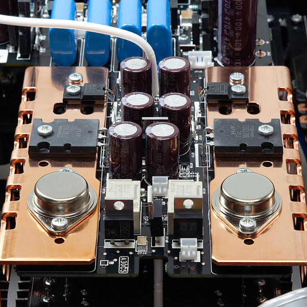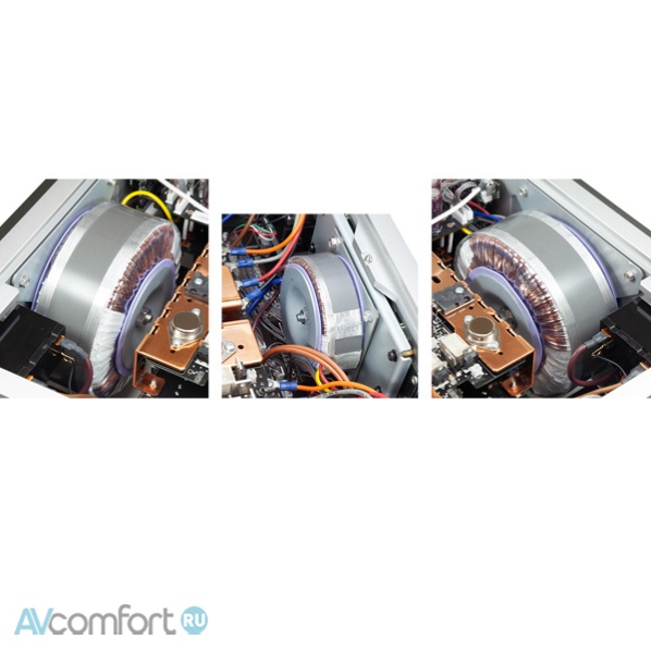 Для усиления мощности используются 2 непропитанных тороидальных силовых трансформатора мощностью 700 ВА слева и справа. Кроме того, в одном корпусе размещены три силовых трансформатора, включая силовой трансформатор системы управления. Все они установлены вертикально, так что силовые линии магнитного поля параллельны плате.