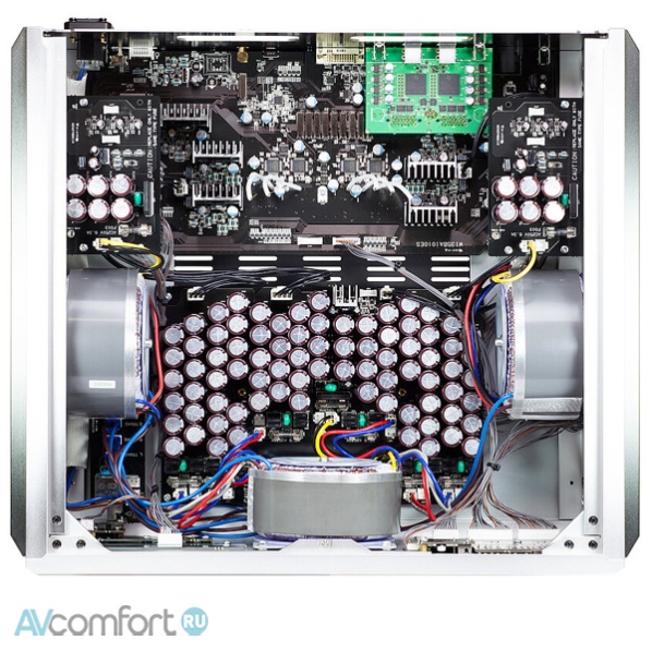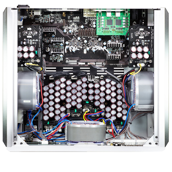 Силовой блок разделен на три независимых трансформатора — цифровой, аналоговый правый и аналоговый левый — каждая секция установлена независимо на боковой стороне алюминиевого основания, которое передает любые вибрации трансформатора от каждого основания к заземляющему шипу. Каждый из трех трансформаторов установлен вертикально параллельно печатной плате, чтобы предотвратить возможные шумовые помехи в цепях, вызванные потоком утечки.