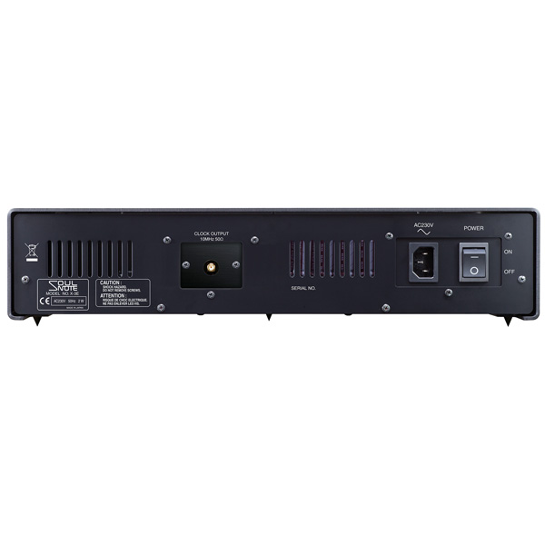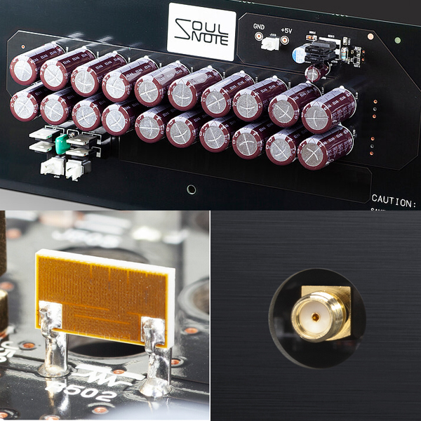 Тороидальный трансформатор высокой мощности 200 ВА, обычно используемый в усилителях мощности мощностью 100 Вт, обеспечивает достаточный источник питания для управления кварцевым генератором. Выпрямительный диод основан на сверхбыстродействующих SiC-диодах. Группа выпрямителей состоит из многочисленных электролитических конденсаторов небольшой мощности с малой емкостью, соединенных параллельно, а стабилизатор включает в себя уникальный дискретный источник питания Soulnote, не поддерживающий NFB.