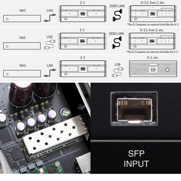 Вы можете создать идеальный отдельный сетевой плеер, вставив модуль оптической связи или модуль RJ45 в порт SFP и используя его в качестве входа LAN, а затем используя соединение ZERO LINK с D-3 или S-3 версии. Этот метод подключения позволит создать звук высочайшего качества.