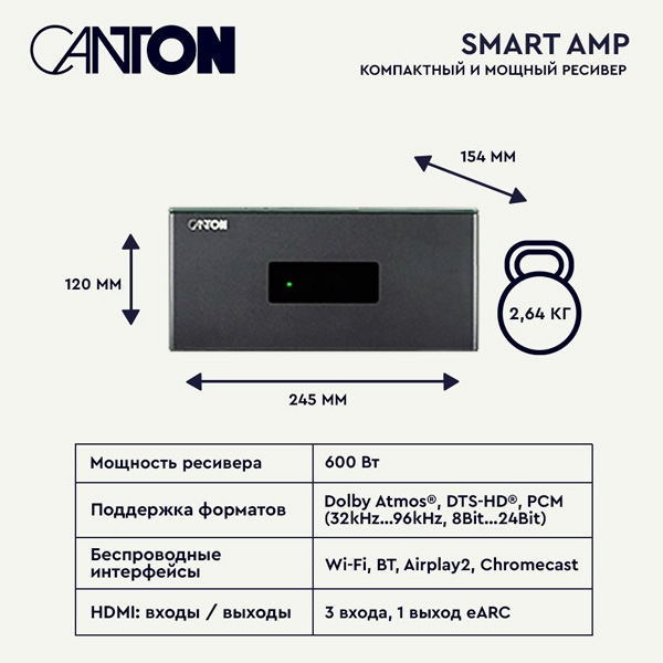 Canton Smart Amp 5.1 — это интеллектуальный, компактный AV-усилитель, который может заменить громоздкие и тяжелые ресиверы в эпоху минимализма в дизайне гостиных. Мощный 600-ваттный Smart Amp 5.1 легко контролирует несколько пассивных и беспроводных акустических систем — вплоть до многоуровневой системы Dolby Atmos в конфигурации 7.1.4. Его можно гибко настроить под ваше помещение и тембральные предпочтения с помощью пульта дистанционного управления и экранного меню.