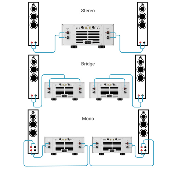 На каждый канал работают два усилителя, обеспечивая более экстремальное качество звука. Он обеспечивает еще более продвинутый режим работы для отдельных громкоговорителей высокого класса или двухпроводных громкоговорителей, раскрывая потенциальные возможности громкоговорителей.