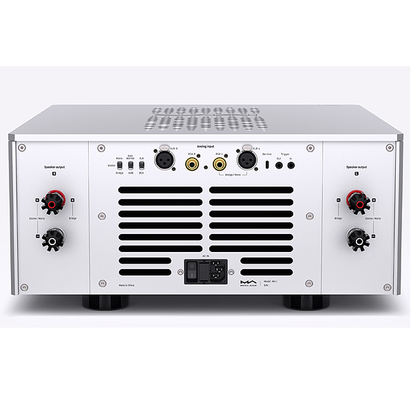 Информация взята с сайта avcomfort.ru Усилитель мощности MA-1 – это первая в истории Matrix Audio модель в классе АВ. Выходные каскады каждого из каналов построены на десятке транзисторов ONSEMI, что обеспечивает низкое выходное сопротивление и соответственно высокий коэффициент демпфирования. При потребляемой «на холостом ходу» мощности до 300 Вт, усилитель обеспечивает выходную мощность в 250 Вт на канал при нагрузке 8 Ом и 450 Вт на 4 Ома. Стандартный стереорежим работы можно, при необходимости, переключить в мостовой или моно. Также переключается и коэффициент усиления: стандартное значение в 30 дБ можно ослабить на 6 дБ.