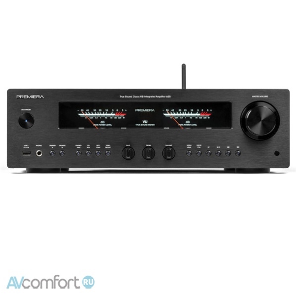 Premiera A3S - современный интегральный Hi-Fi стереоусилитель класса AB со встроенными сетевым проигрывателем, MM/MC фонокорректором, ЦАП, Bluetooth, HDMI ARC, Wi-Fi и AirPlay 2, с номинальной выходной мощностью 110 Вт на канал. При общей сдержанности дизайна, свойственной всем устройствам Premiera, A3S выделяется своими крупными и яркими стрелочными VU-индикаторами вместо дисплея на лицевой панели и ручками темброблока под ними. Эти два элемента придают модели нео-винтажный вид, столь модный сегодня. При этом управление усилителем без дисплея и меню не стало менее удобным – кнопки и потенциометры прекрасно справляются, даже сложные процедуры вроде обновления ПО или возврата к заводским установкам можно провести, используя комбинации кнопок на лицевой панели. К тому же всегда поможет пульт дистанционного управления.