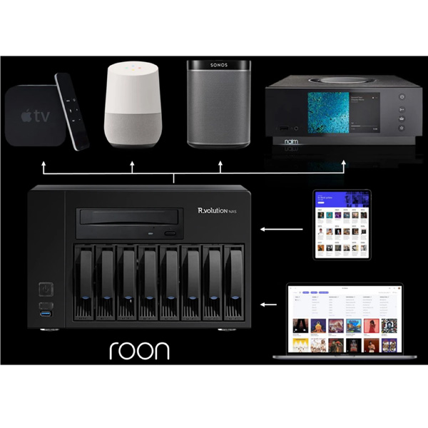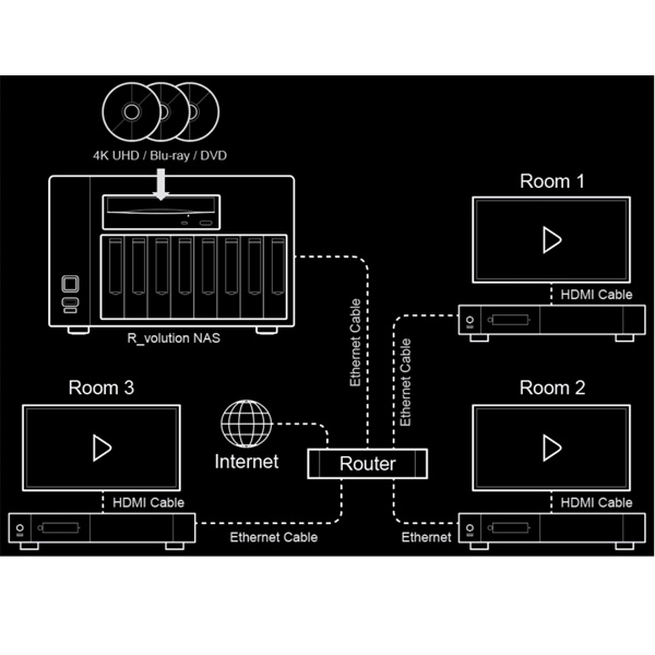 Наслаждайтесь бесперебойной доставкой фильмов, телепередач и концертов по стандартной домашней сети с помощью R_volution NAS. Он позволяет одновременно транслировать на проигрыватели R_volution в вашем доме. С DVD, Blu-ray и 4K Ultra HD Blu-ray, хранящимися на R_volution NAS, вы можете мгновенно получить доступ к своим медиа с любого проигрывателя в доме.