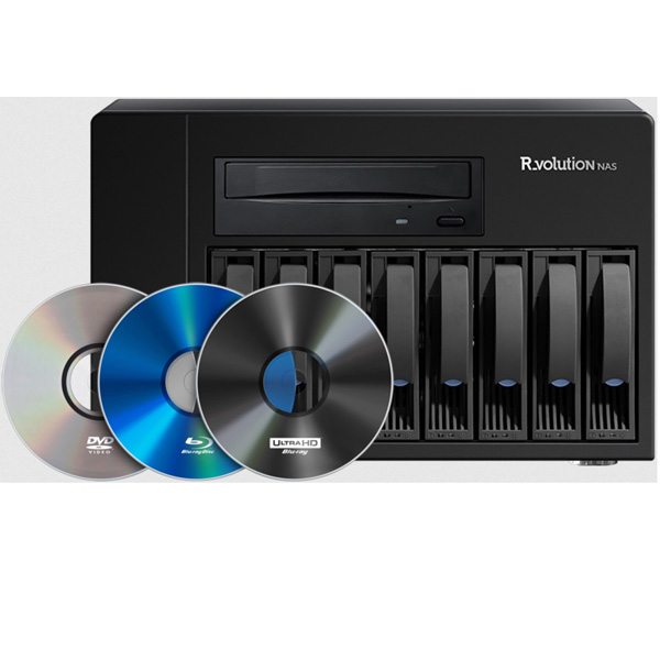 Благодаря высокопроизводительной технологии обработки видео и приложению Media Center R_video, R_volution NAS позволяет вам создавать дематериализованную аудио/видеобиблиотеку из ваших DVD, Blu-ray, Blu-ray 3D и 4K Ultra HD Blu-ray дисков. R_volution NAS дематериализует вашу музыку и видео и сохраняет их на жестких дисках без сжатия или потери качества. R_volution NAS обладает высокой масштабируемостью и способен продолжать работать даже после сбоя диска без потери контента.