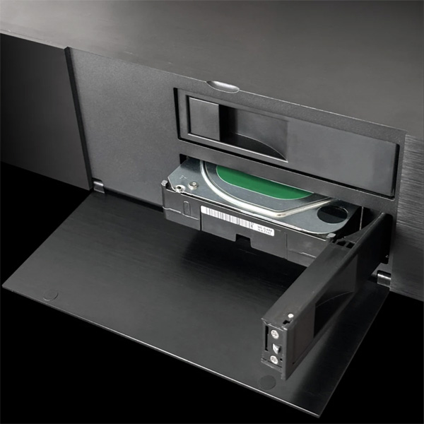 R_volution PlayerPro 8K, оснащенный двумя 3,5-дюймовыми стойками SATA с возможностью горячей замены, может обрабатывать впечатляющие 64 ТБ данных на одном разделе — что примерно эквивалентно 1600 Blu-ray или 800 4K Ultra HD Blu-ray на одном жестком диске. Благодаря возможности замены жесткого диска предела для емкости хранилища нет! Попрощайтесь с проблемами хранения с PlayerPro 8K. R_video без труда организует всю вашу коллекцию на нескольких дисках. Если вы выберете фильм, который хранится на жестком диске, который в данный момент не находится в проигрывателе, R_video предложит вам вставить правильный диск, обеспечивая бесперебойный доступ к вашим медиафайлам.