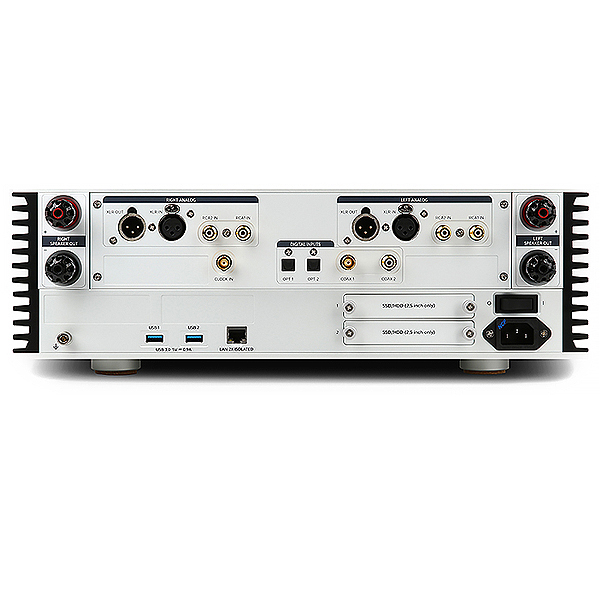 Но сердцем Aurender AP20, безусловно, является фирменный сетевой стример и блок ЦАП. Для подключения цифровых источников предусмотрены два оптических и два коаксиальных (один на разъёме BNC) входа. Есть и вход синхронизации на BNC для подключения внешнего тактового генератора. Интеграция в компьютерную сеть только проводная – через порт Ethernet RJ45. Кроме того, Aurender AP20 способен воспроизводить аудиофайлы с внешних накопителей, для чего у него есть два порта USB 3.0. Но и это ещё не все! Аппарат оснащён двумя слотами для установки внутренних накопителей форм-фактора 2,5 дюйма – SSD или HDD. Таким образом, можно хранить фонотеку внутри Aurender AP20, минимизировав количество элементов и кабелей в системе.