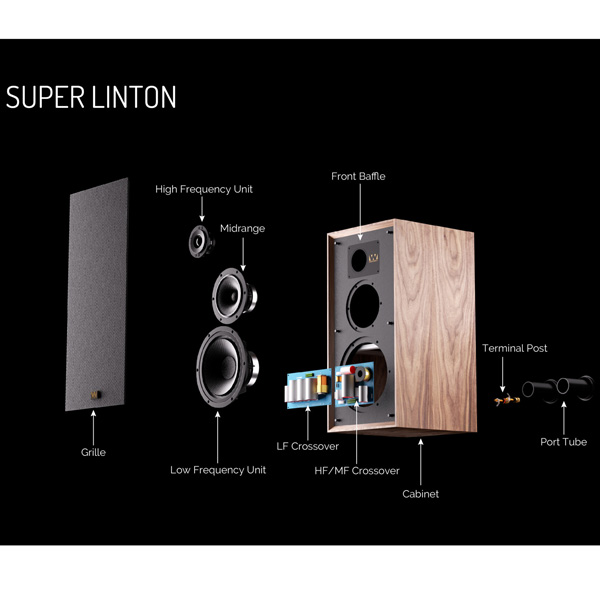 Для высокочастотного выхода Super Linton оснащен легким тканевым куполом, покрытым специальным демпфирующим материалом и поддерживаемым керамической магнитной системой двигателя, что способствует его приятному и детальному характеру. Измененный профиль короткого рупора обеспечивает плавный отклик вплоть до верхней середины, а новый дизайн передней панели улучшает дисперсию высоких частот, соответствуя переходному воздействию и детализации нового басового блока.