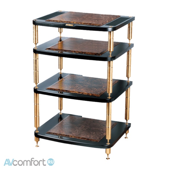 Информация взята с сайта avcomfort.ru Полка: МДФ высокой плотности, толщина полки 30 мм. Обработка торца полки эмалью итальянской фирмы Sayerlack. Платформы под компонент на каждой полке: 450х450 мм, плита МДФ с отделкой дорогим шпоном прикорневого среза ореха, платформы обеспечивают дополнительную развязку через специальные демпфирующие элементы. Опоры: цельнолитые, из высокопрочной нержавеющей стали 304-й марки, напыление нитрид титана создает благородный цвет золота.