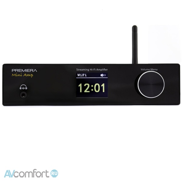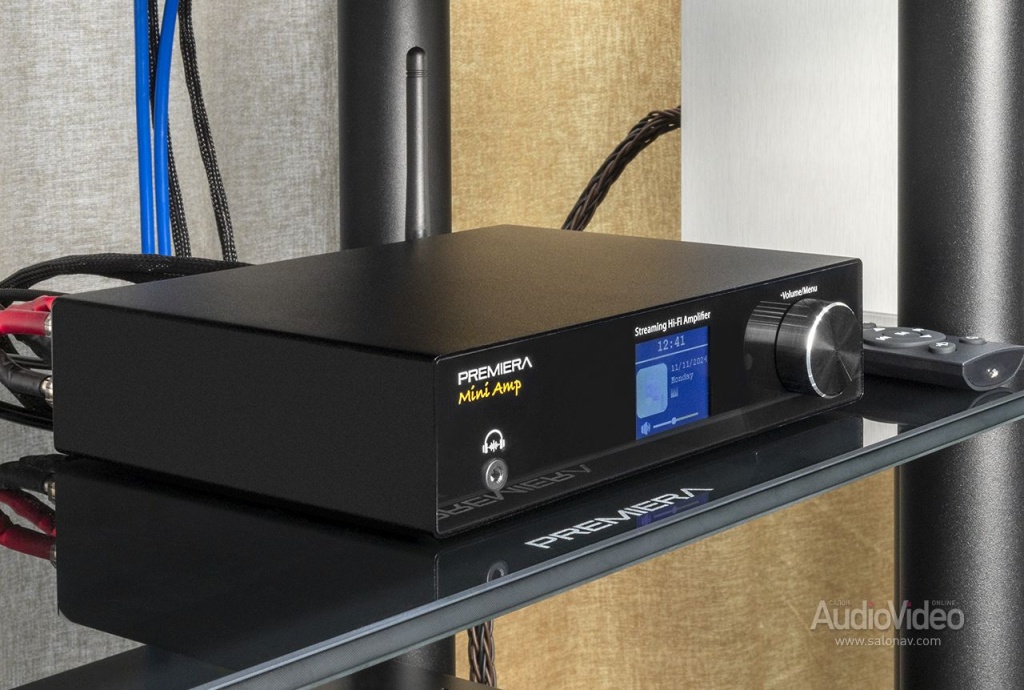 Premiera Mini Amp - современный интегральный Hi-Fi стереоусилитель класса D (ШИМ) со встроенными сетевым проигрывателем, ЦАП, Bluetooth, HDMI ARC, Wi-Fi и AirPlay 2, с номинальной выходной мощностью 100 Вт на канал (при нагрузке 4 ома).