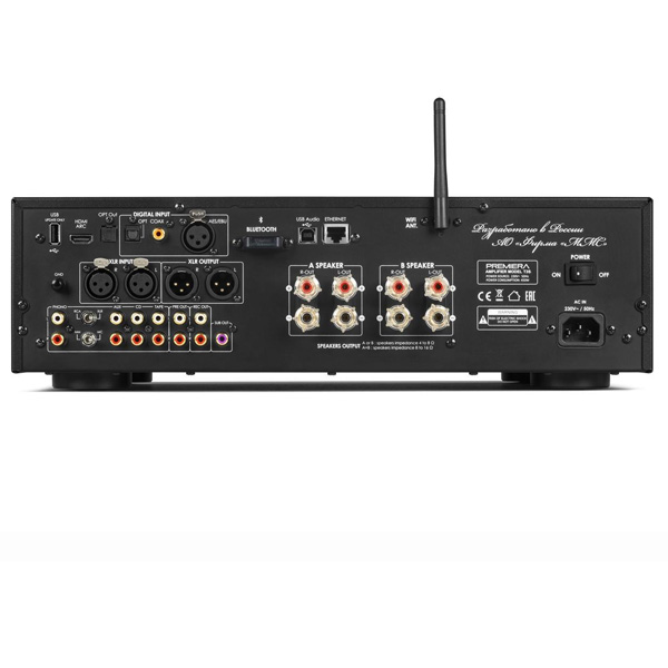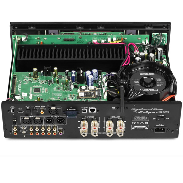 Premiera T3S - разработанный в России высококачественный гибридный Hi-Fi стереоусилитель класса AB с ламповым каскадом предварительного усиления, со встроенными сетевым проигрывателем, ММ/МС-фонокорректором, ЦАП, Bluetooth aptX, HDMI ARC, Wi-Fi и AirPlay 2 и с номинальной выходной мощностью 115 Вт на канал (8 Ом) предназначен для использования в профессиональных и домашних стереосистемах.