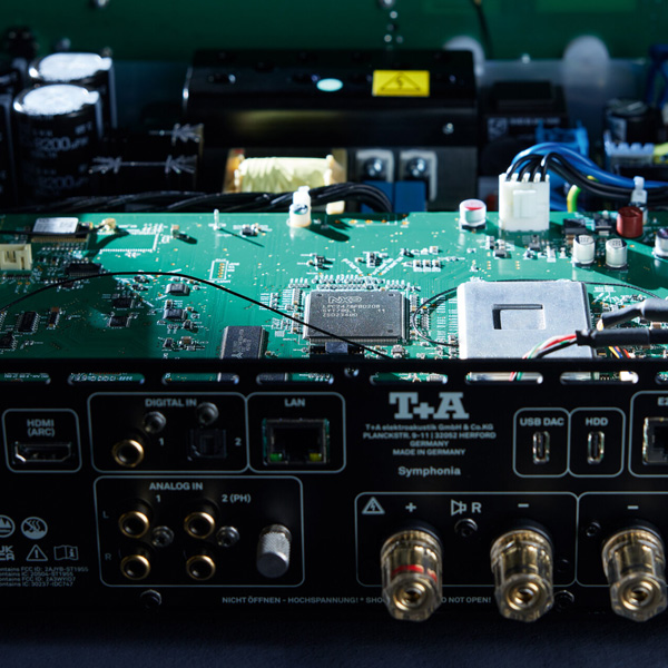 Коммутационный арсенал усилителя T+A Symphonia включает как аналоговые, так и цифровые входы, а также вход встроенного фонокорректора. Есть здесь и тюнеры для приёма как аналогового FM-радио, так и цифрового DAB, а также интернет-радио. Все популярные потоковые сервисы доступны через фирменное приложение. T+A Symphonia также поддерживает открытый стандарт UPnP. Подключение к сети можно осуществить с помощью кабеля Ethernet или по беспроводной сети Wi-Fi (802.11ax 2x2 MIMO), также поддерживается Bluetooth. Помимо стандартных кодеков SBC и AAC, Symphonia также поддерживает воспроизведение несжатого FLAC через двунаправленную технологию aptX HD Bluetooth, что позволяет транслировать аудио со своего мобильного устройства на Symphonia или, в качестве альтернативы, с Symphonia на наушники Bluetooth, такие как наушники T+A Solitaire T.