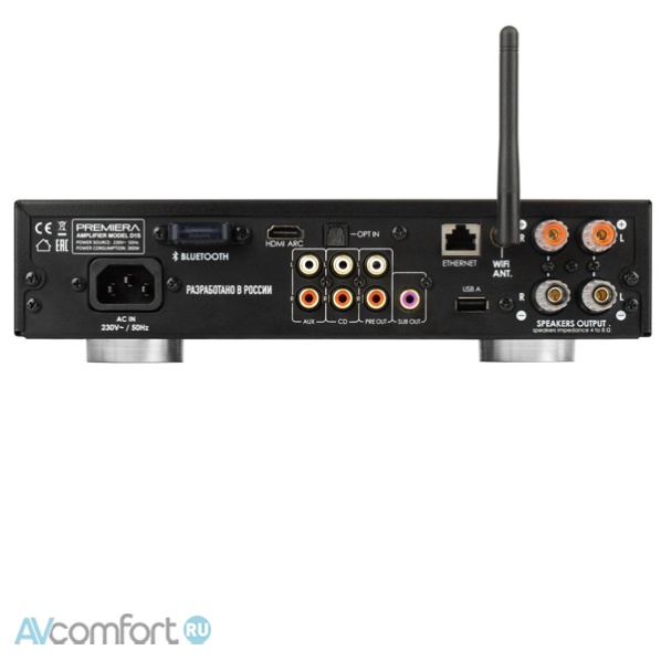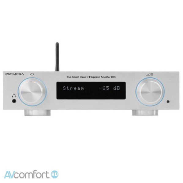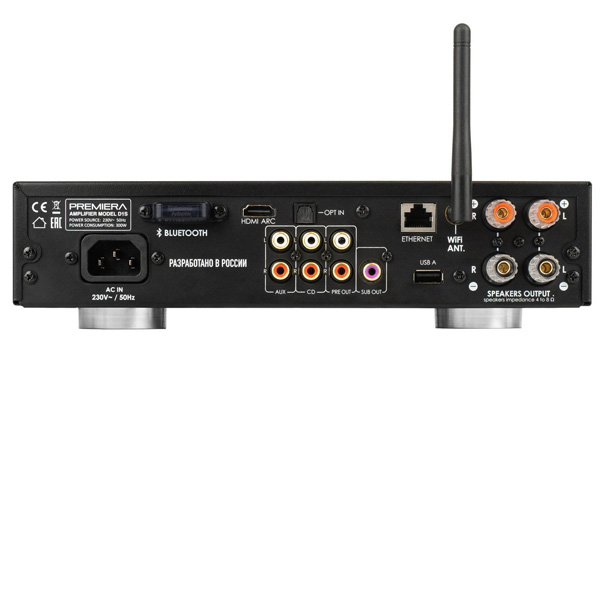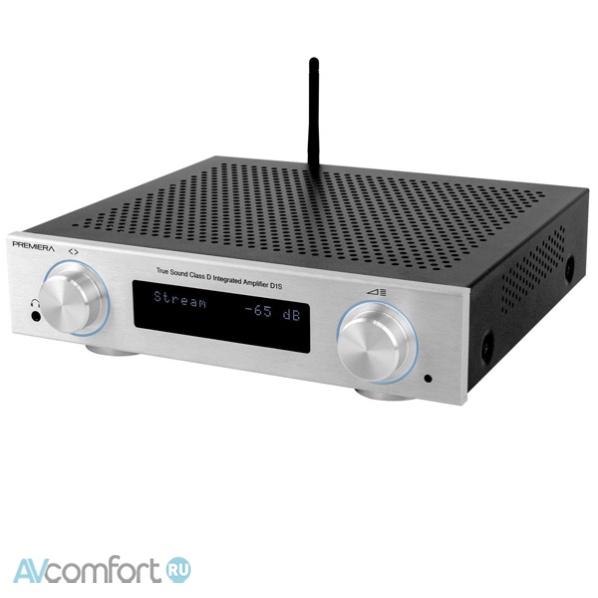 Premiera D1S – интегральный Hi-Fi стереоусилитель класса D со встроенными сетевым проигрывателем, ЦАП, Bluetooth aptX HD, HDMI ARC, USB, Wi-Fi, AirPlay 2, с номинальной выходной мощностью 101 Вт на канал (4 Ом), с возможностью подключения семи источников входного сигнала (два из них - аналоговые), и с тремя аналоговыми выходами – два стерео (регулируемым для внешнего усилителя и для наушников) и один моно (для активного сабвуфера).