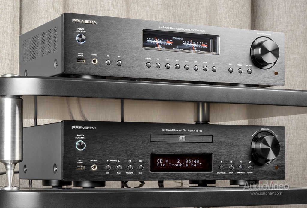 Premiera A1VU – интегральный Hi-Fi стереоусилитель класса AB со встроенными ММ-фонокорректором, ЦАП, USB, Bluetooth, стрелочными VU-индикаторами, с номинальной выходной мощностью 51 Вт на канал (8 Ом), с возможностью подключения восьми источников входного сигнала и тремя аналоговыми выходами – два стерео (для записи и для наушников) и один моно (для активного сабвуфера).