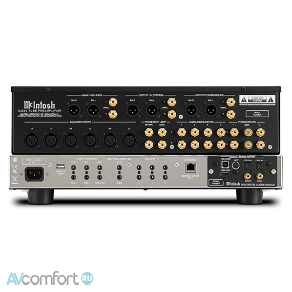 C2800 оснащен возвратом Processor Loop, чего не было в последних нескольких поколениях предусилителей McIntosh. Processor Loop позволяет вам подключать внешний процессор сигнала (например, эквалайзер MQ112 или систему коррекции помещения MEN220), расширители динамического диапазона или другие устройства без необходимости размещать его между предусилителем и усилителем(ями) мощности. Обычно это удобнее и может обеспечить лучшую производительность.