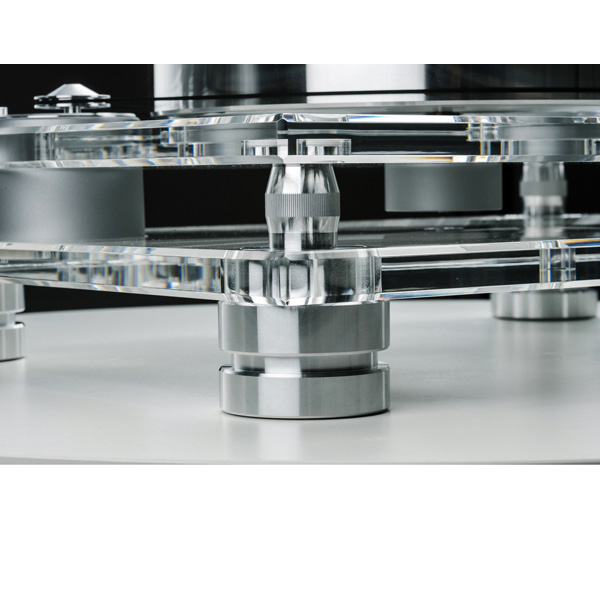 Четыре тяжелые алюминиевые ножки с TPE-амортизацией и магнитной поддержкой соединяют два акриловых цоколя с тефлоновыми прокладками между ними. Вы можете отрегулировать их по высоте, поворачивая рифленую среднюю часть ножек, чтобы выровнять поворотный стол.