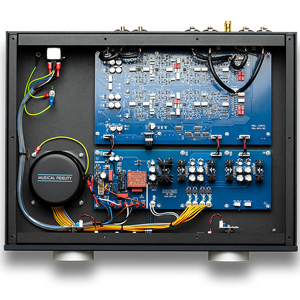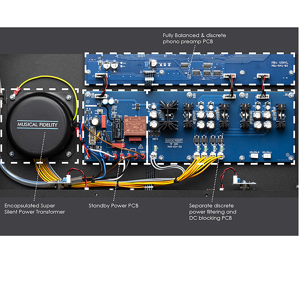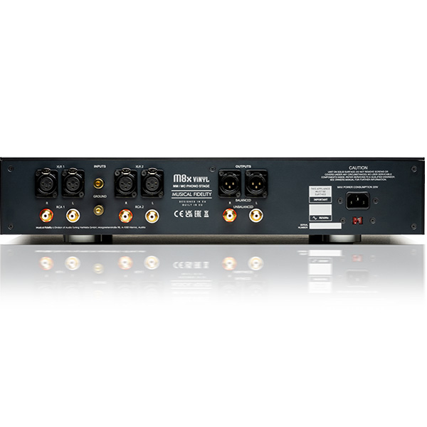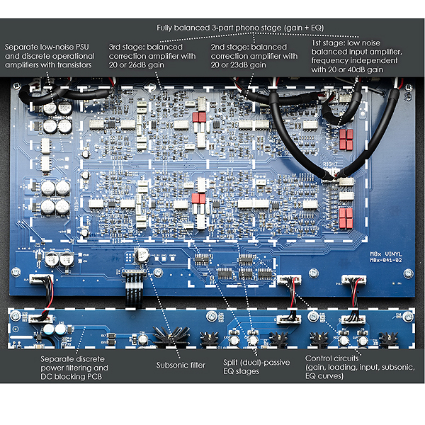 По сравнению со своим аналогом M6, M8x Vinyl теперь имеет полностью сбалансированную аудиосхему внутри. Это означает, что внутри в два раза больше дискретных компонентов, так как сигналы + и - каждого канала получают свой собственный фонокорректор, состоящий из трех каскадов усиления, работающих на полностью дискретной транзисторной схеме класса A.