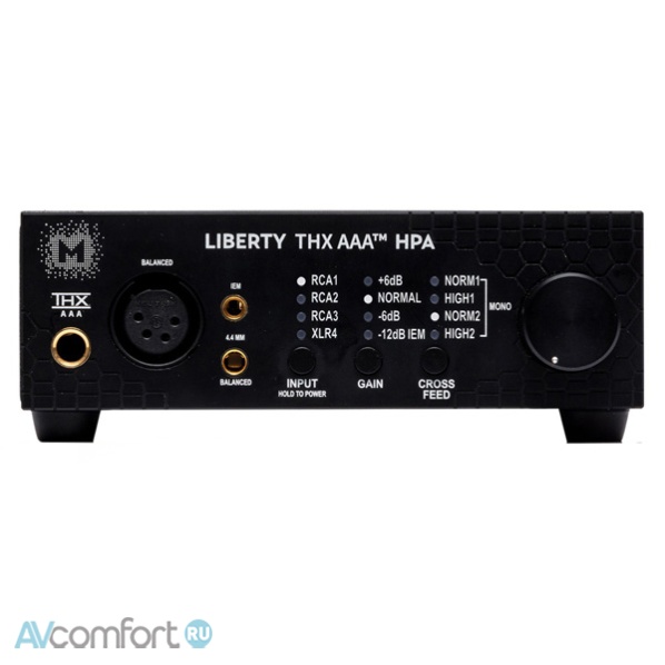Из разъемов у этой версии Liberty есть четыре линейных входа: три RCA и один балансный XLR формата 1/4 дюйма. Из выходов предусмотрены четырехпиновый XLR, 4,4-мм балансный, 1/4-дюймовый TRS и 3,5 мм для внутриканальных мониторов (при подключении уровень гейна автоматически падает на 12 дБ). Также предусмотрен и RCA-выход предусилителя — в таком режиме Liberty THX AAA HPA тоже можно использовать. Переключатель «Crossfeed/Mono» позволит подстроить работу устройства под другие элементы аудиосистемы. За регулировку уровня громкости отвечает крупный 27-мм аттенюатор от Alps....