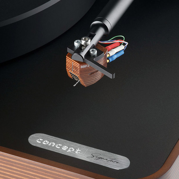 Основной диск Concept Signature диаметром 30 см дополнен алюминиевым субдиском, во вращение он приводится пассиком с «паразитным» роликом, стабилизирующим натяжение независимо от состояния самого «ремня». Подшипник — проверенная «сталь в бронзе», на фторопластовом подпятнике.