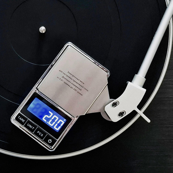 - Аккуратно поместите иголку картриджа в центр площадки для взвешивания весов. На дисплее весов появится значение прижимной силы. Нажимая кнопку UNIT, можно выбрать различные единицы измерения (граммы/унции/литры/караты/граны)