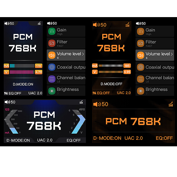 На выбор доступны четыре темы, которые имеют два варианта цветового исполнения, каждый из которых представлен в вертикальной и горизонтальной теме. Также есть в меню и возможность повернуть экран на 180 градусов. Для трех тем на экране предусмотрено отображение потребляемого тока и напряжения. На экране отображается вся необходимая информация о текущих настройках ЦАПа, также есть всплывашки при переключении Desktop Mode, play/pause и переключения треков. Для настройки громкости включается отдельный экран с визуализацией, и текущая громкость также отражается в верхнем левом углу экрана.
