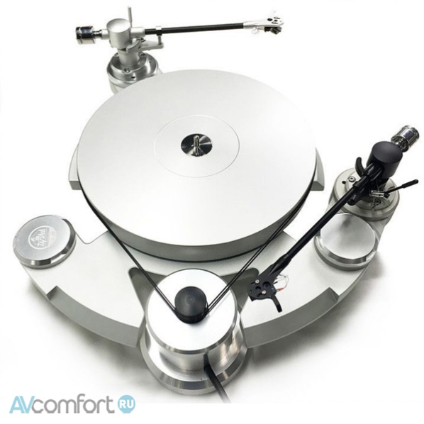 Информация взята с сайта avcomfort.ru Следуя философии устранять любые вибрации, в качестве первого шага, был взят цельный алюминиевый авиационный сортовой прокат. Из него выфрезеровали основание проигрывателя с помощью фрезы с алмазным наконечником. В результате чего получилась форма с гладкой поверхностью без внешних волн, не вызывающая резонанса. Во-вторых, на нижней стороне диска проигрывателя с помощью сверхточного станка с программным управлением выфрезеровали градиентные скосы для рассеивания вибраций. Наконец, изолировали диск и подшипник от основания с помощью 15-миллиметровой акриловой манжеты, на которой находится подшипник, поэтому подшипник диска не имеет прямого контакта с основанием.