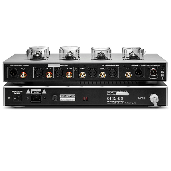 Из других усовершенствований конструкции по сравнению с устройствами ранних версий стоит отметить наличие симметричного входа XLR для подключения проигрывателей с картриджами MM и MC; отдельную пассивную схему коррекции в усилительной секции – она реализована без использования отрицательной обратной связи, которая вызывает ухудшение звука; полипропиленовые плёночные конденсаторы в каскадах усиления и RIAA-коррекции вместо прежних конденсаторов MKP; повыщающий трансформатор с аморфным сердечником Lundahl LL1932 в каскаде MC; специальные диоды с малошумящими резисторами в выпрямительной схеме; выносной блок питания с тороидальным трансформатором, с двойным экранированием между первичной и вторичной обмотками, разработанным специально для модели E.A.T. E-Glo FB.