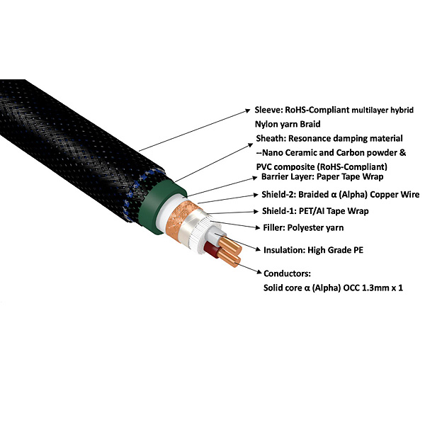 Керамический и углеродный порошок для улучшения передачи сигнала. Также имеются разъемы специальной цельной конструкции, многослойное серебряное углеродное волокно 3K на корпусе из немагнитной нержавеющей стали и штифт трубки OCC с родиевым покрытием, пропитанный лучшим антистатическим и резонансно демпфирующим материалом Furutech – NCF.