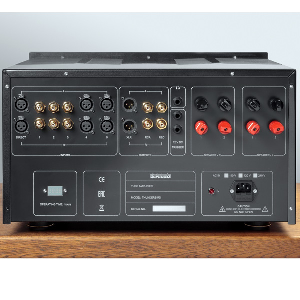 Усилитель имеет пять линейных входов (3 х RCA, 2 х XLR), вход Direct, три выхода (XLR, RCA и Rec), выход на наушники и четыре пары акустических терминалов разработки S.A.Lab. Стальной корпус и передняя панель усилителя Thunderbird из искусственного камня декорируются высококачественной автомобильной эмалью с полировкой, из линейки Ferrari (12 цветов на выбор)...