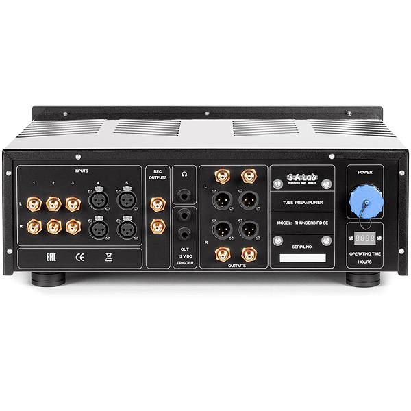 На выходе Thunderbird SE стоит электронная лампа, аналог C3G. Все лампы проходят криогенную обработку и имеют гарантию 5 лет. Предусилитель имеет на фронтальной панели новый индикатор матричного типа. В Thunderbird SE предусмотрены 5 линейных входов (3 RCA, 2 XLR), 2 выхода (RCA, XLR), выход на запись, на наушники и сигнала триггера. Есть индикатор времени наработки.