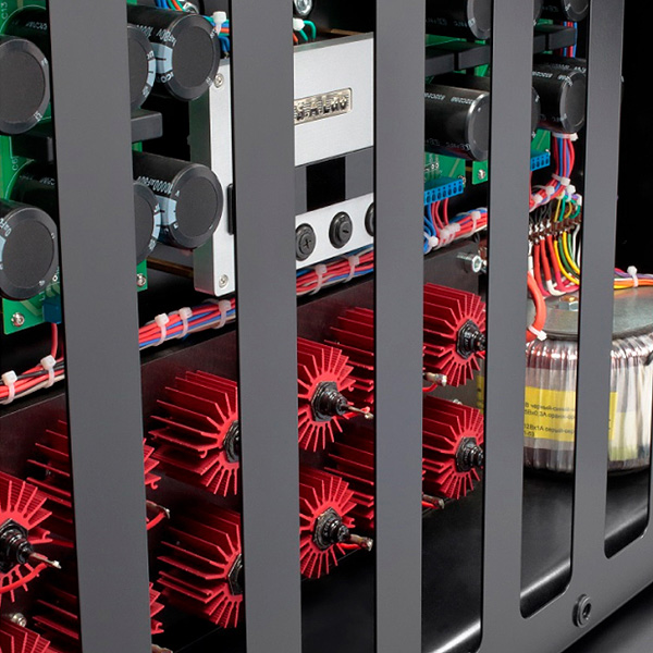 В блоке питания усилителей мощности работают конденсаторы общей емкостью 80 000 мкФ, выпрямители реализованы на германиевых диодах с радиаторами для каждого. Изготовленные S.A.Lab прецизионные пленочные конденсаторы емкостью 470 мкФ шунтируют питание после стабилизаторов.