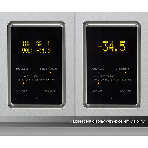 Флуоресцентный дисплей имеет функцию диммирования и отлично виден на фоне ослепительно-белой передней панели. Мы также позаботились об удобстве просмотра с места прослушивания. Обычно на нём отображаются уровни входной и выходной громкости, но с пульта дистанционного управления уровень громкости отображается на дисплее. С пульта дистанционного управления дисплей можно увеличить в четыре раза. Кроме того, состояние различных переключателей функций можно контролировать с помощью светодиодных индикаторов внутри акриловой панели.