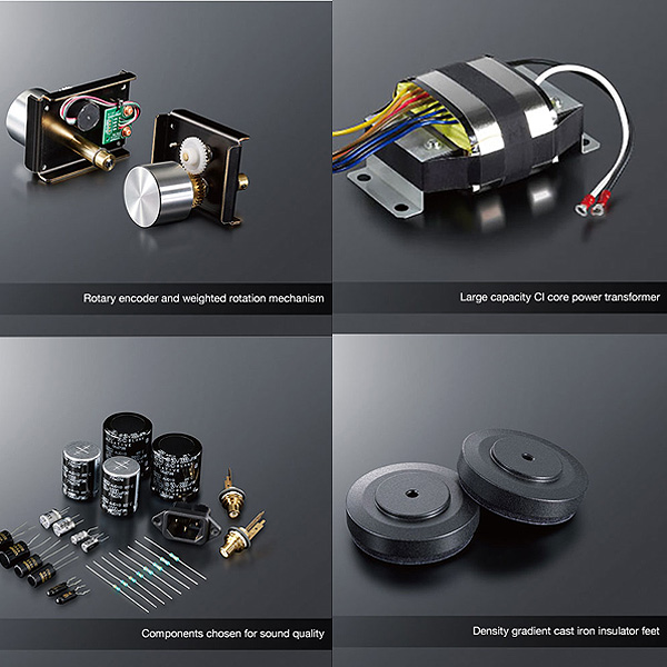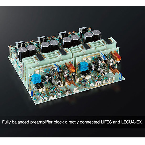 Для системы регулировки громкости мы усовершенствовали электронный аттенюатор LECUA, который переключает ряд постоянных резисторов, расположенных в определённом порядке в схеме. LECUA-EX, считывающий импульсы движения вращающегося энкодера, полностью отключённого от тракта аудиосигнала, полностью подавляет ухудшение качества звука и обеспечивает плавную регулировку громкости. Схема предварительного усилителя LIFES собрана из специально разработанных компонентов и напрямую подключена к системе LECUA-EX. Четыре блока расположены в полностью балансной конфигурации и находятся в абсолютно идентичных рабочих состояниях, что позволяет реализовать идеальную структуру предварительного усилителя.