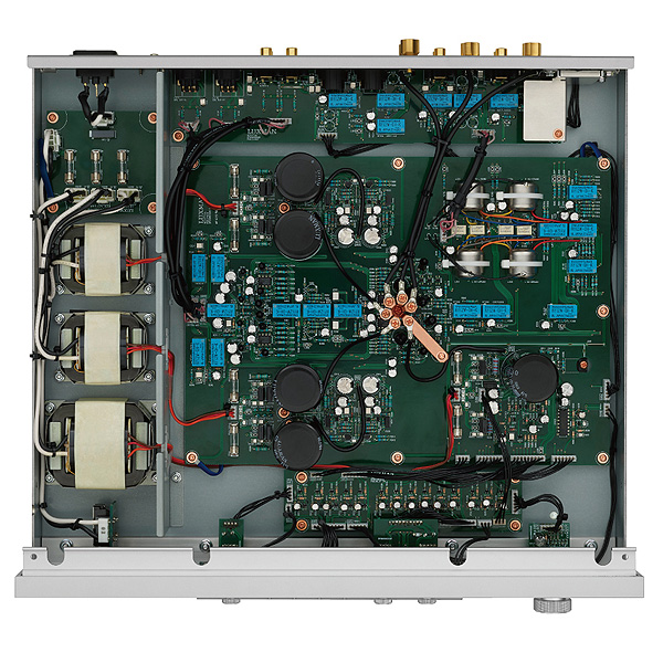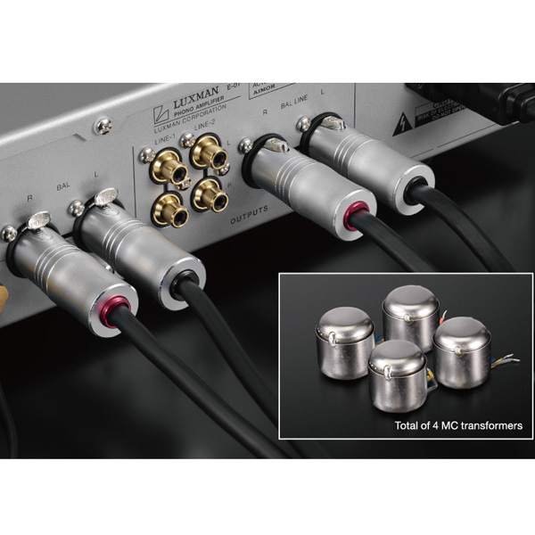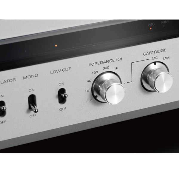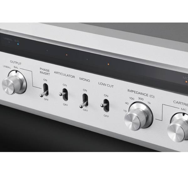 Он состоит из двух независимых блоков для каждого канала и имеет низкий/высокий коэффициент усиления, что позволяет оптимально выбирать трансформатор в зависимости от выбранной группы импеданса. Кроме того, он поддерживает балансные входы, которые могут принимать дифференциальные сигналы от MC-картриджей без потери выходной энергии, улучшая разделение левого и правого стереоканалов и локализацию звукового образа. Варианты входов включают одну балансную пару (XLR) и две небалансные пары (RCA), что позволяет создавать универсальные аналоговые системы воспроизведения, подключая различные усилители.