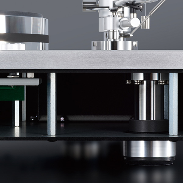 Подвесная конструкция, в которой основные компоненты закреплены на алюминиевой пластине толщиной 15 мм, обеспечивает высокую жёсткость и демпфирующие характеристики. Кроме того, благодаря размещению системы привода двигателя и силового трансформатора на сверхтолстой нижней пластине, изолированной демпфирующей резиной, чувствительный приёмник сигнала защищен от внешних вибраций, что значительно улучшает механическое соотношение сигнал/шум (гул) и устойчивость к обратной связи.