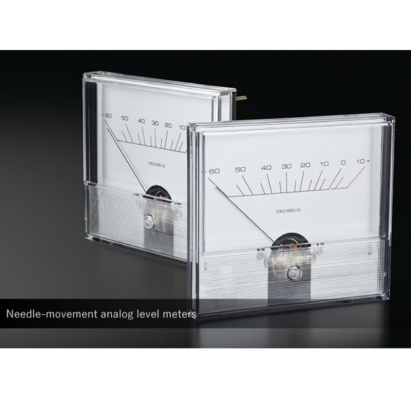 Передняя панель, имеющая простой, но элегантный дизайн, оснащена стрелочными аналоговыми индикаторами уровня. Светодиодная подсветка эффективно освещает обе шкалы индикаторов, обеспечивая лучшую видимость с места прослушивания. Расположение индикаторов оптимизировано таким образом, что рабочий индикатор левого канала находится точно по центру и имеет приоритет при использовании режима прослушивания BTL (моно).